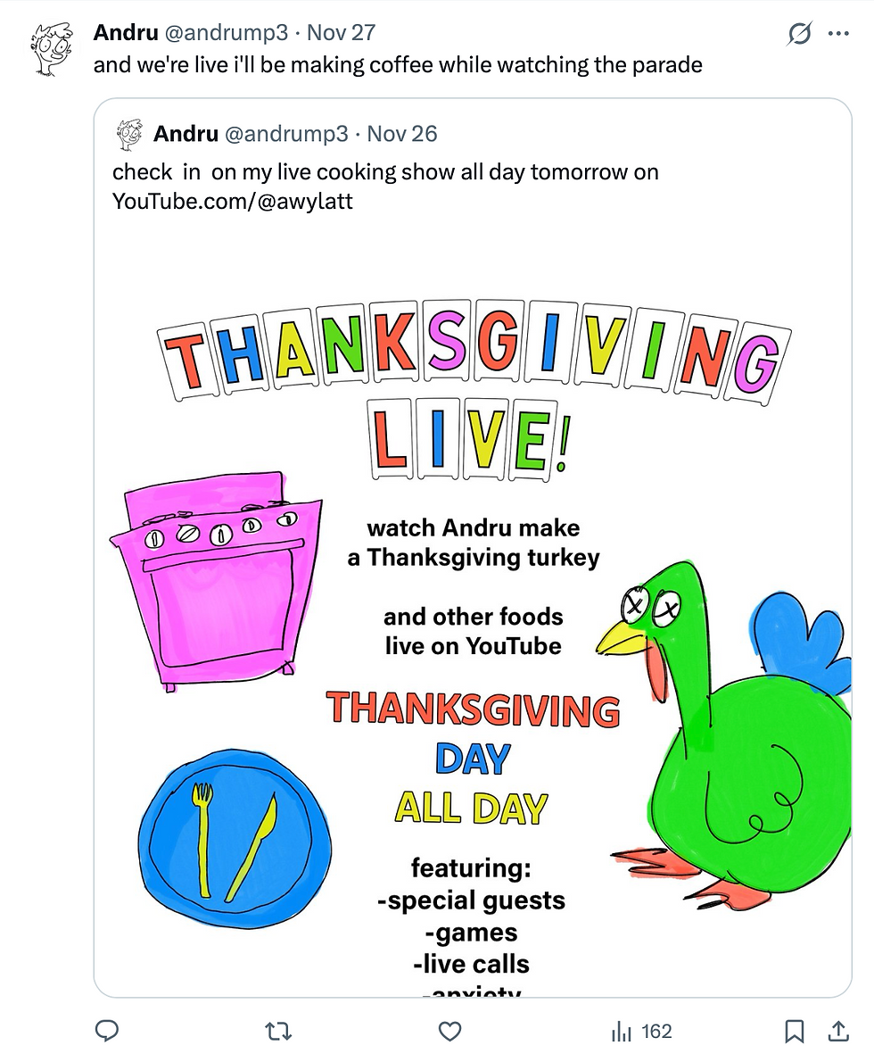 [quote tweeting my announcement of my Thanksgiving Live show on YouTube] and we're live i'll be making coffee while watching the parade